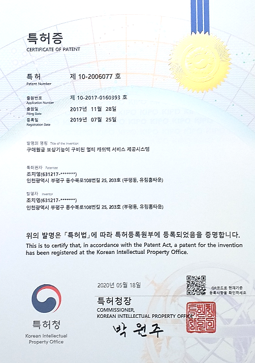 • - 07월 25일 포인트 자동증식시스템 특허등록 (구매원금 보상기능이 구비된 멀티 캐시백 제공 시스템)