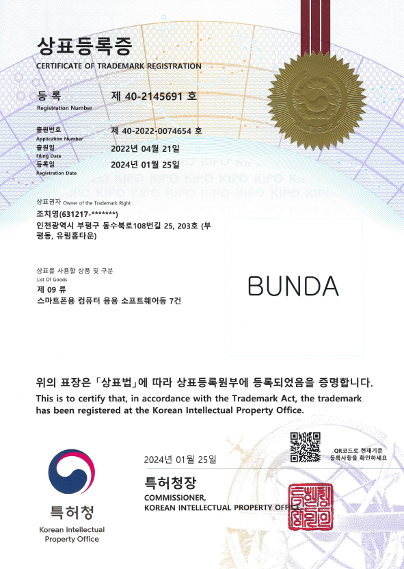• - 01월 25일 번다 플랫폼 상표등록 3건 완료 - BUNDA/BUNDA SINGER / BATTLE SINGER